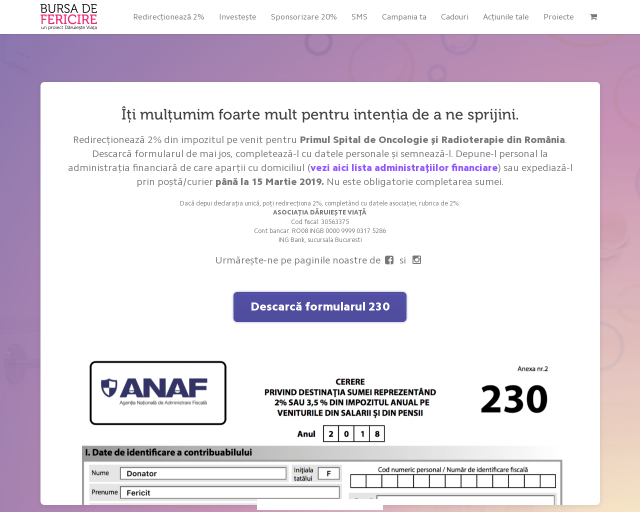 Bursa de Fericire reprezintă platforma online de strângere de fonduri a Asociației Dăruiește Viață, pentru proiecte din domeniul sănătății. Tu investești bani, noi construim în spitale: camere sterile, laboratoare performante, clinici de oncologie, săli de operație, compartimente de terapie intensivă, compartimente de transplant de celule stem, clinici de radioterapie. Toate acțiunile sunt alocate eficient și transparent, fiecare investitor putând vedea destinația fondurilor în orice moment.