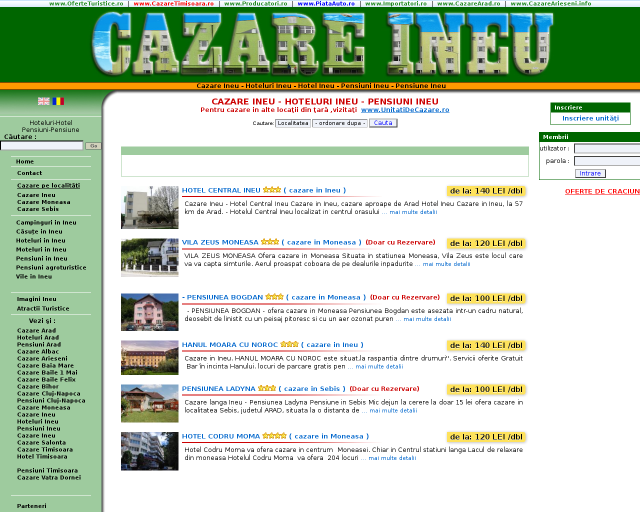 Cazareineu.ro este un portal cu unitati de cazare din Ineu. Este vorba despre orasul Ineu din Judetul Arad. Fiecare unitate de cazare este prezentata cu detalii si cu imagini suficiente ca sa lamureasca pe oricine este in cautare de cazare in Ineu. La fiecare unitate de cazare poate fi listata si telefonul unitatii sau doar un formular de rezervare.